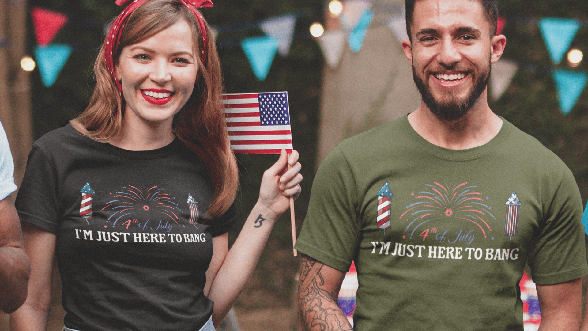 Get ready to spark some laughs this 4th of July with our hilarious design! Featuring a vibrant burst of fireworks in the center, flanked by rocket illustrations, this tee boldly proclaims "I'm just here to bang." Perfect for anyone who loves a good laugh and a spectacular fireworks show, this shirt is sure to be a hit at any Independence Day celebration. Made from the high-quality Gildan 5000 fabric, it's comfortable, durable, and perfect for all your summer festivities. Embrace the fun and let everyone know you're here for a banging good time!