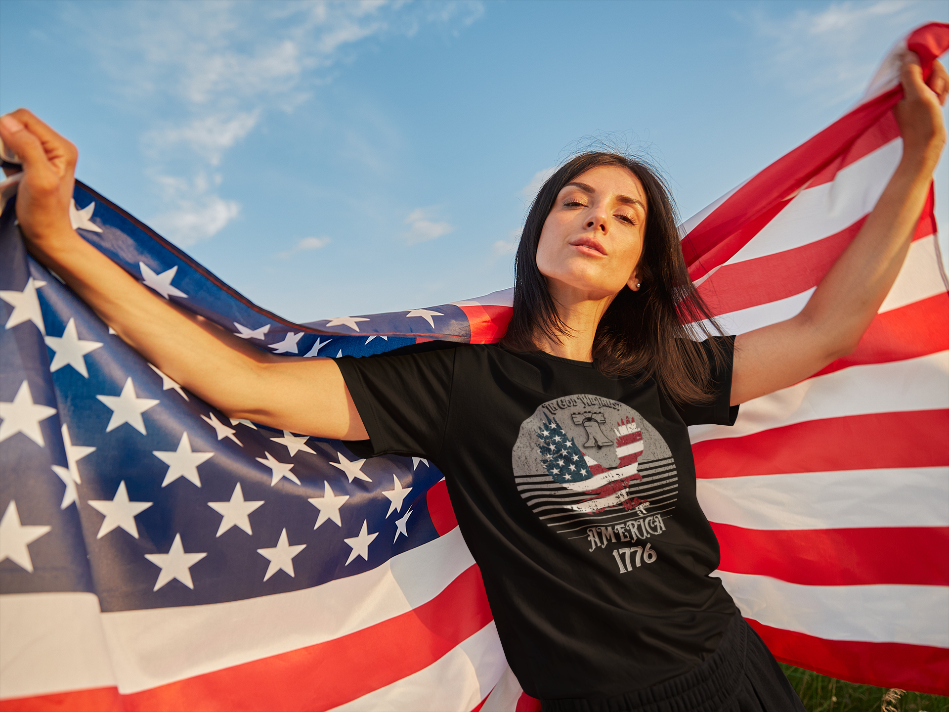 Celebrate the true spirit of America with our "Eagle of Freedom" Gildan 5000 tee! Featuring a majestic diving eagle wearing a United States flag mask over a silver retrosunset background, this shirt embodies patriotism and strength. The curved text "In God We Trust," reminiscent of a United States coin, crowns the design, with the cracked Liberty Bell adding a touch of historic reverence. Below, "America 1776" proudly marks the birth of our nation.